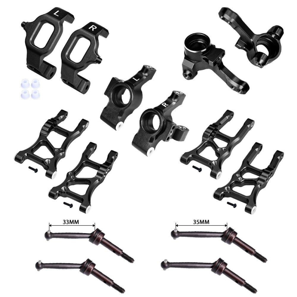 • Front and rear knuckle arms with multiple positioning holes to adjust the angles of the dampers that suits different play modes. Front and rear CVD, harden steel #45 plus nutrified and hardening process, more durable to use. CVD design for larger steering angle and smooth performance.