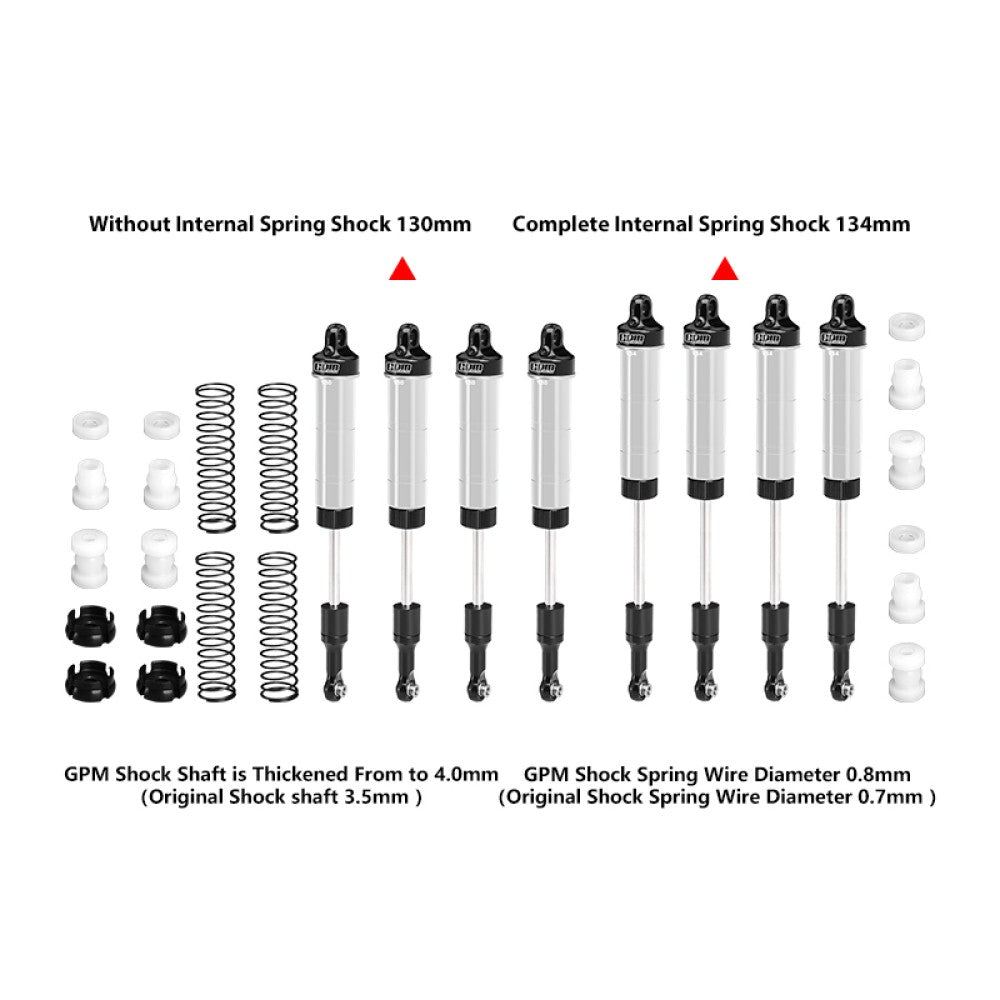 - Package includes : Front/Rear Without Internal Spring Shock 130mm-4pcs ; Front/Rear Complete Internal Spring Shock 134mm-4pcs ; Special Delrin collar-8pcs ; Spring Retainer (For 130mm Shock Absorber)-4pcs ; Black Spring wire diameter 0.8mm (For 130mm Shock Absorber)-4pcs.