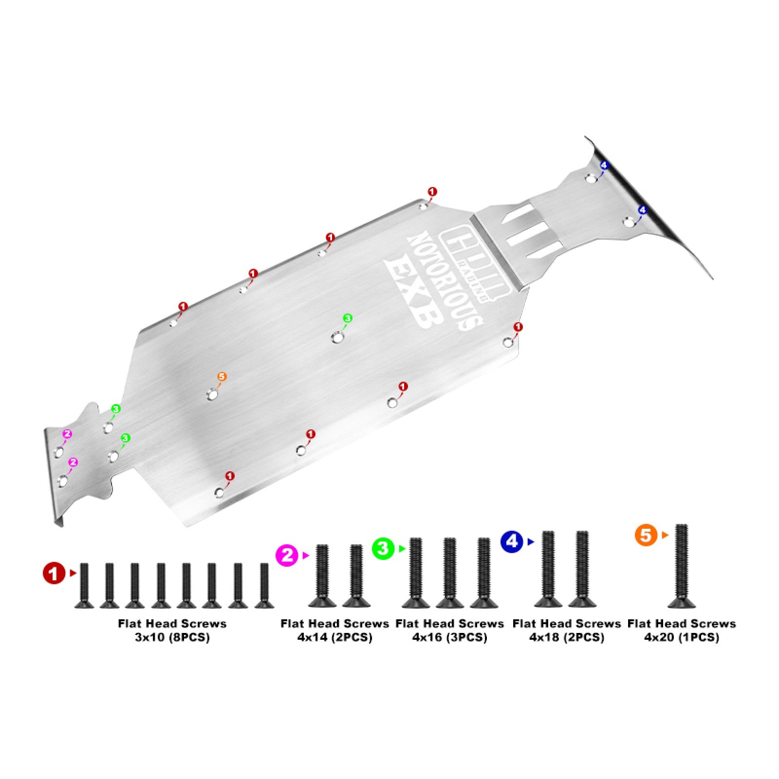 - Package includes : Front, centre and rear integrated Chassis Skid KIT-1pc ; Grade 12.9 black Flat Head Screws 3x10-8pcs ; Grade 12.9 black Flat Head Screws 4x18-2pcs ; Grade 12.9 black Flat Head Screws 4x16-3pcs ; Grade 12.9 black Flat Head Screws 4x14-2pcs ; Grade 12.9 black Flat Head Screws 4x20-1pc.