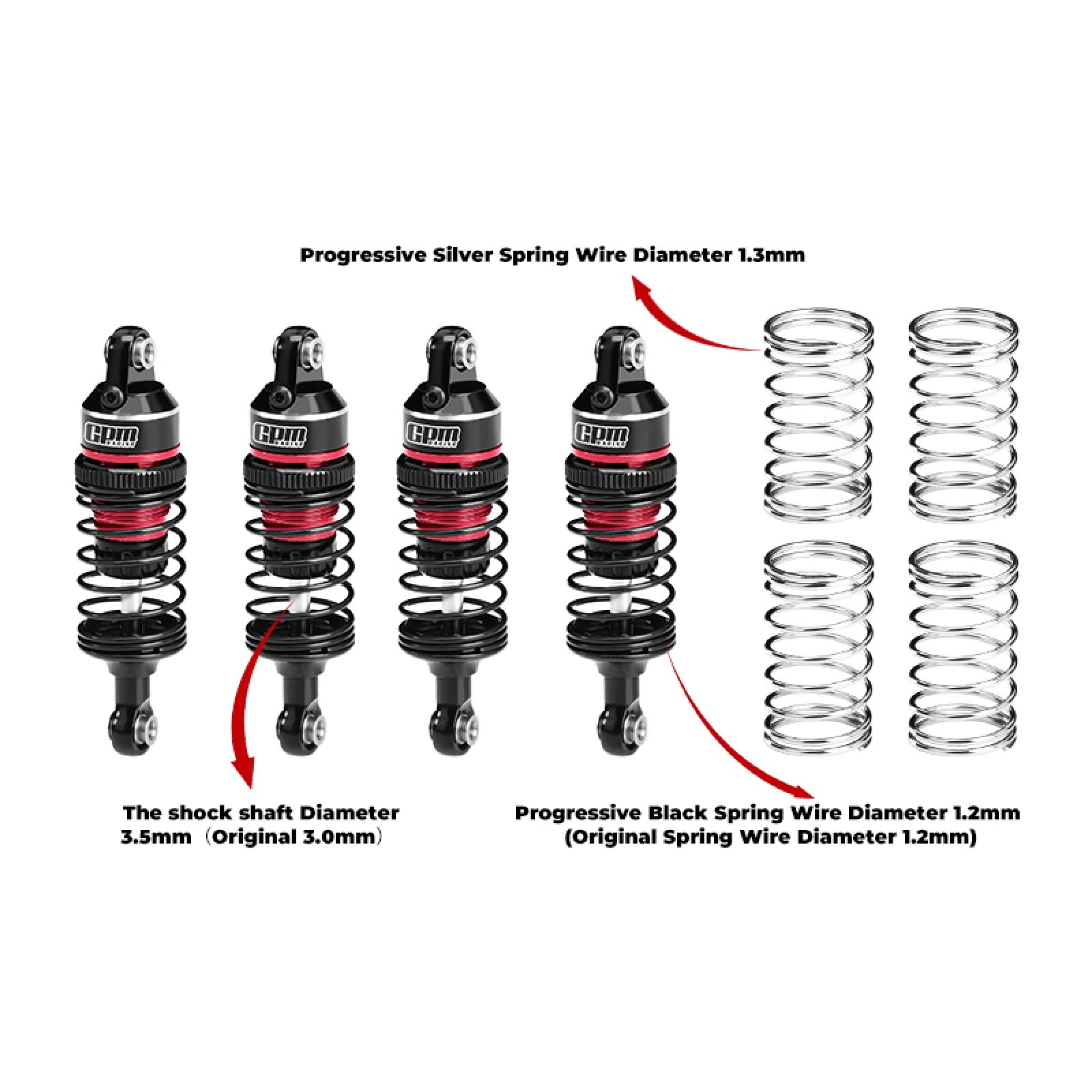 - Pre-installed black progressive spring of wire diameter 1.2mm. Additional silver progressive spring (1.3mm wire diameter) is provided and can be replaced according to your own needs. Progressive spring design, more dynamic adaptability, spring stiffness changes with load (soft first and then hard), can better adapt to different road conditions or load conditions.