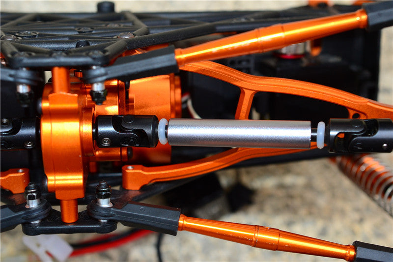 • Made by harden steel #45 universal swing shafts cross head design with aluminum shaft body. These shafts are light weight, durable, and adjustable in length (Front : 105-115mm. Rear : 105-115mm). They greatly improve steering and crawling angles. Silicone o-rings are added onto the shafts to prevent direct touch of the head and the body. The shaft head is specially measured and has a pin lock to prevent loose or falling apart during crawling up and down.