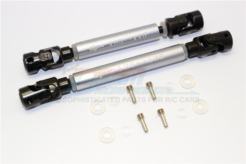 - Made by harden steel #45 universal swing shafts cross head design with aluminum shaft body. These shafts are light weight, durable, and greatly improve steering and crawling angles. Silicone o-rings are added onto the shafts to prevent direct touch of the head and the body. The shaft head is specially measured and has a pin lock to prevent loose or falling apart during crawling up and down. Front shaft adjustable range is 125-135mm and rear shaft is 105-115mm.