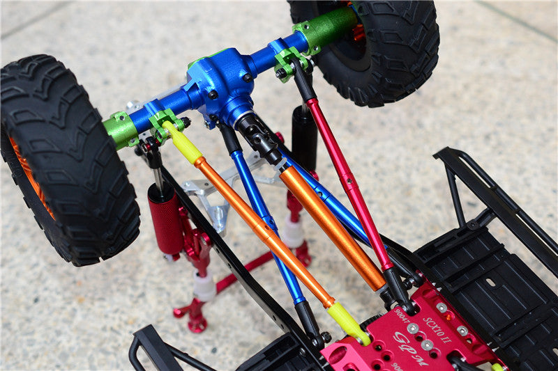 - Package includes : 1 x Long front steering tie rods (145mm), 1 x Short front steering tie rods (106mm), 1 x Front supportive adjustable tie rod with spring (88-118mm), 2 x Front upper chassis link tie rod (110mm), 2 x Front lower chassis link tie rod (122mm), 2 x Rear upper chassis link tie rod (136mm), 2 x Rear lower chassis link tie rod (144mm), 4 x Internal spring shocks (103mm), 1 x Adjustable main shaft Long (140mm-150mm), 1 x Adjustable main shaft Short (125mm-135mm).