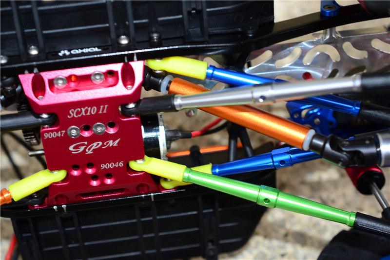 - Made by harden steel #45 universal swing shafts cross head design with aluminum shaft body. These shafts are light weight, durable, and greatly improve steering and crawling angles. Silicone o-rings are added onto the shafts to prevent direct touch of the head and the body. The shaft head is specially measured and has a pin lock to prevent loose or falling apart during crawling up and down. Front shaft adjustable range is 100-110mm and rear shaft is 130-140mm.
