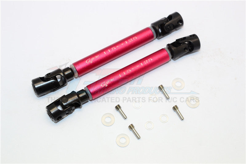 - Made by harden steel #45 universal swing shafts cross head design with aluminum shaft body. These shafts are light weight, durable, and greatly improve steering and crawling angles. Silicone o-rings are added onto the shafts to prevent direct touch of the head and the body. The shaft head is specially measured and has a pin lock to prevent loose or falling apart during crawling up and down. Front and rear shafts adjustable range is 115-125mm.